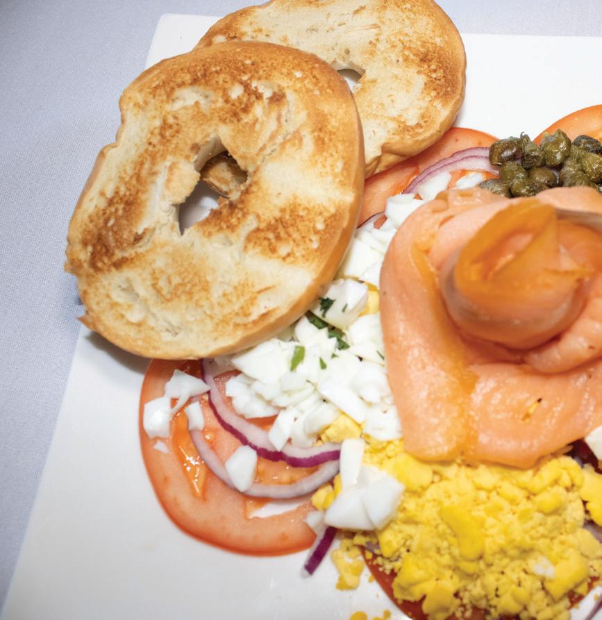 many brunch options: pancakes, waffles, French toast, benedicts, hash, and omelets. Over those scrumptious muffins and martinis, we take 30 minutes to make our choices: A bagel and lox –a classic plain bagel topped with cream cheese, strips of salt-cured salmon filet, and chopped hard-boiled eggs, garnished with red onions, tomatoes, and capers, arrives with homefries, and