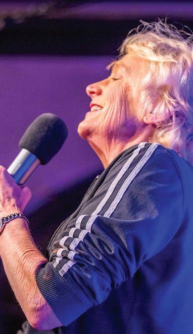 things for content as well but adds a physical component. “I’m very animated in my style,” says Arundel, who took Champlin’s comedy class in 2018. “I am not a comedian that just stands there and talks: I am all over the stage; I’m on the floor, I’m gesturing. It’s all very natural – it’s like something turns on and I just go.”
