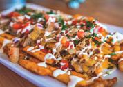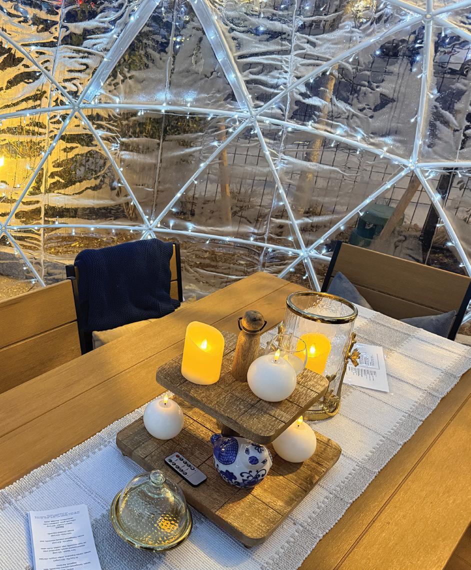 Inside our glowing geodesic, it’s snug and dreamy. A patio set of a long table and chairs is furnished with lap blankets and nubby textiles, and there are electric candles and a miniature fireplace lending to the ambience set by the strands of lights. While we’re perusing the binder of seven menus, our server enters the snow globe and takes our drink orders. One member of our group decides we must have an app with our drinks, heads to the food hall and returns with a scrumptious mezze platter from Tolia, a Turkish eatery. We make short work of the hummus, whipped feta, and muhammara – a dip made from pomegranate molasses, red pepper, and walnuts. Two of us decide on one of the zero-proof seasonal cocktails, the Blood Orange “Rita” – a yummy punch of nonalcoholic tequila, blood orange, and lime, while the others order from the selections of wine and 15 regional beers.