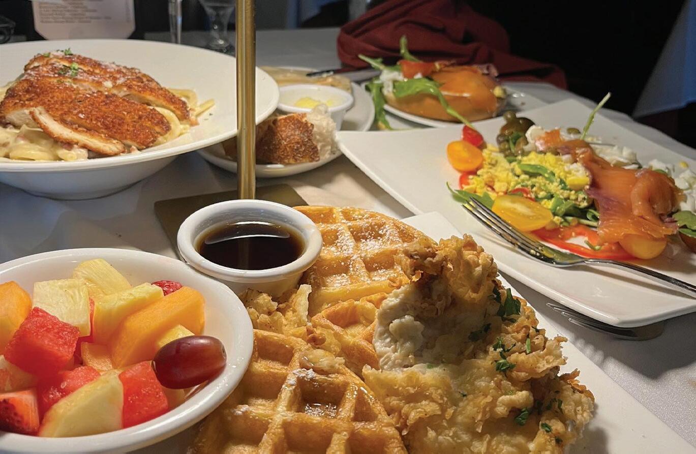 CHICKEN AND WAFFLES ($22.95): Belgian-style waffle, fried buttermilk chicken, maple syrup, butter, and fresh fruit.