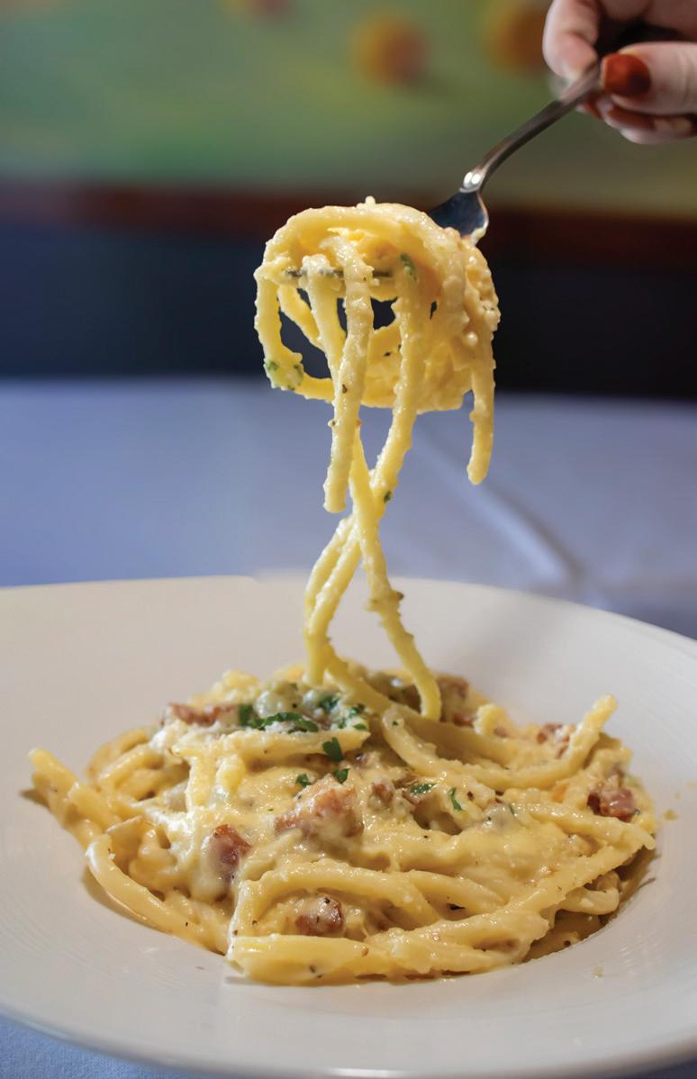 BUCATINI ALLA CARBONARA ($22.95): Fresh pasta simply prepared with pancetta, extra-virgin olive oil, egg yolk, pecorino Romano, and cracked black pepper.