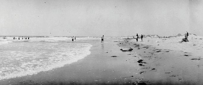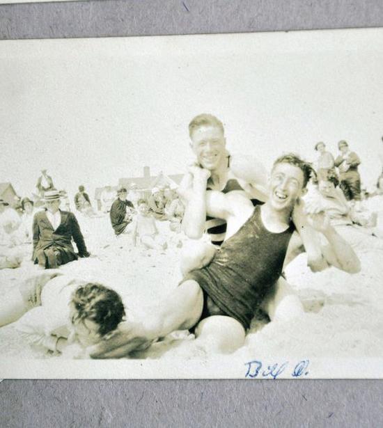 She paged through faded photos of crowds of people in old fashioned bathing suits; some men are in actual suits, and a couple of women carry parasols.