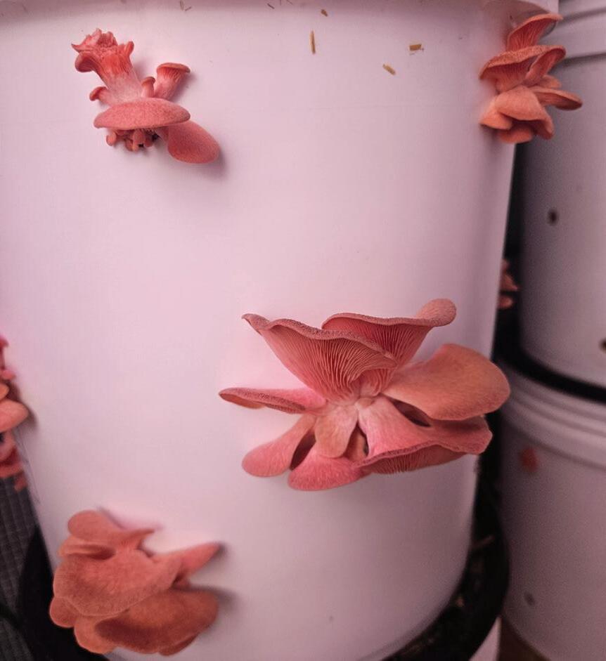 The mushroom buckets are an alternative to the single-use plastic bags commercial growers often use, and he prepares inoculated buckets for customers to grow at home, too. “It’s already colonized and you just stick it outside in the spring or fall.” During winter or summer, the bucket fungi can be supported inside with the right humidity. “You can hang it in the bathroom, and the humidity will actually help trigger them to fruit.”