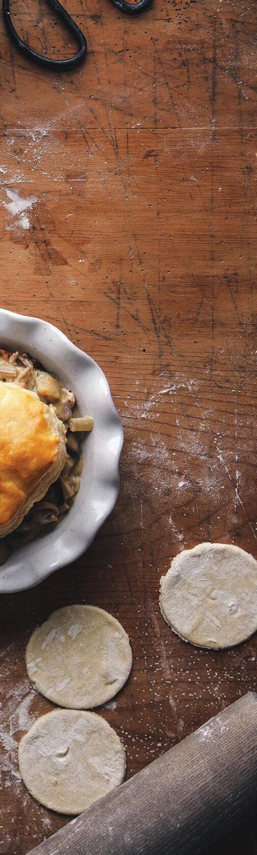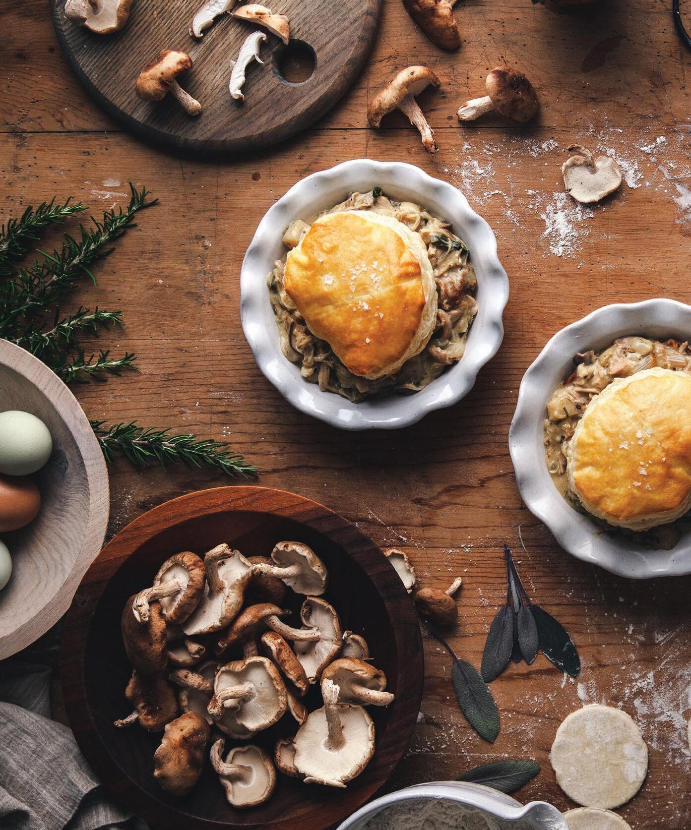 5. Fill pie dishes with chicken-mushroom filling and top each with a puff pastry circle.