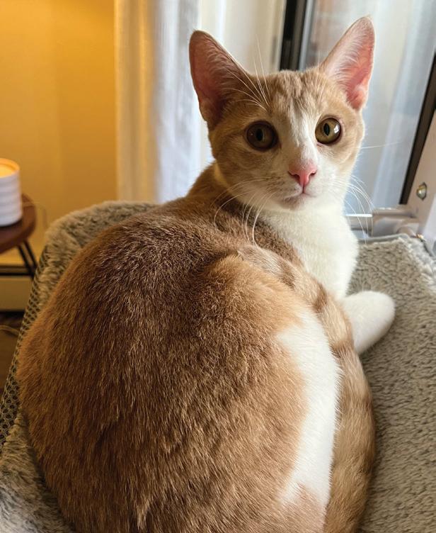 What’s fuzzy and soft on the outside and sweet on the inside? Peach, of course, who is very much still a kitten with lots of playful energy. She is a beautiful domestic shorthair with a pretty orange and white coat which complements her goldengreen eyes! She is currently being fostered with other playful cats and is ready to find her forever home where she can blossom. If you are looking for another feline friend, this kitty is just peachy.