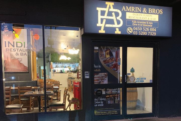 118 Shannon Avenue, Geelong West 0450 526 004 | 0452 618 004 www.amrinbrosrestaurantnbar.com.au AmrinandBrosIndianRestaurantAndBargeelong amrinandbrosgeelong WERRIBEE / GEELONG AMRIN & BROS Indian Restaurant & Bar EAT & DRINK