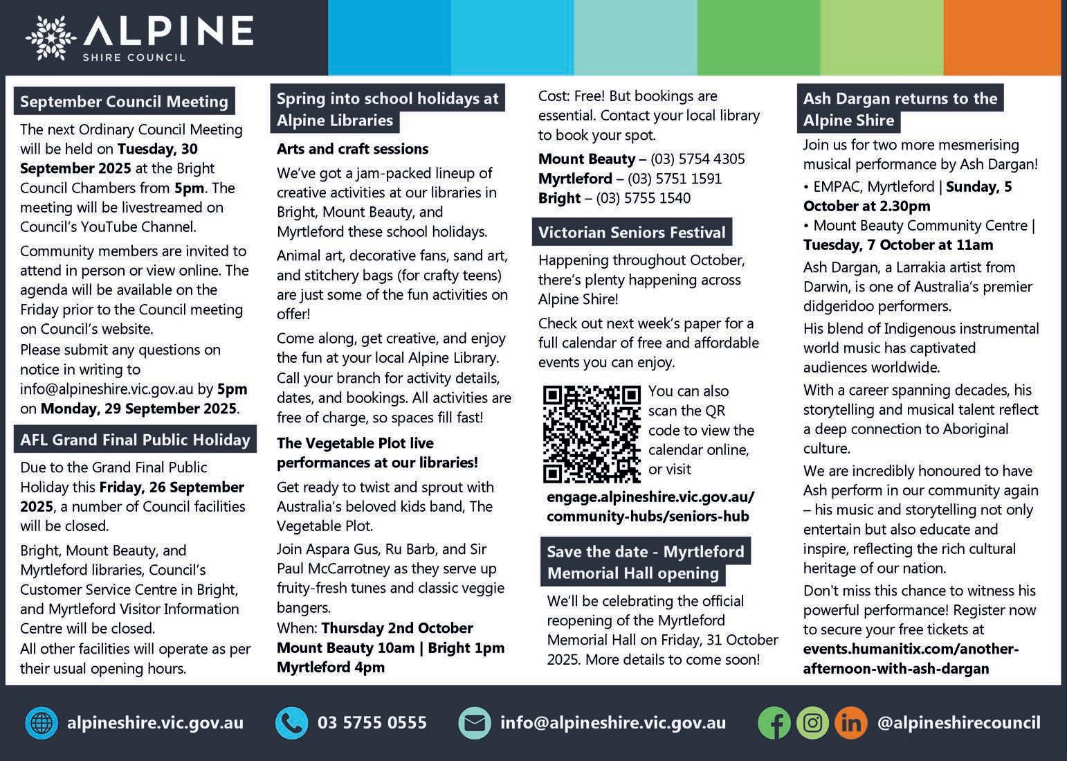 Community members can view the draft Neighbourhood Character Strategy online by visiting Engage Alpine: https://engage. alpineshire.vic.gov.au/ neighbourhood-characterstrategy or contribute in person by visiting the libraries in Bright, Mount Beauty and Myrtleford.