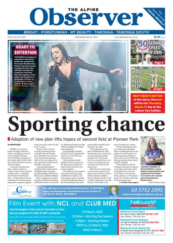 Sporting chance Adoption p of new plan p lifts hopes p of second field at Pioneer Park By MARTIN DAVIS THERE are renewed hopes of major improvements, including a second oval at Bright’s Pioneer Park, following adoption of the Alpine Shire’s 2022-2033 Sport and Recreation Active Plan last week. Councillors backed the plan, which contains a range of other more specific locality plans - including the Pioneer Park Master Plan - to help inform future planning for infrastructure, programs and grant applica-