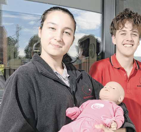 BABY I’M YOURS: (From left) Myrtleford P12 College year 11 students Zali Feltrin and Aaron Kiss with teacher Keira Schaefer and the school’s new female infant simulator.