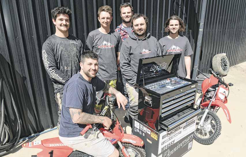 AWESOME AUCTION: Myrtleford Alpine Rally committee members with some of their auction and raffle items for this year’s rally. Pictured are (on bike) Jake Rouse, (top, from left) Jordan Harrington, Jacob Roche, Luke Hodgkinson, Mat Dwyer and Hayden Rouse.