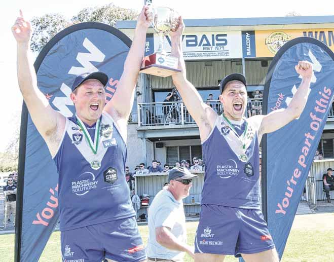 PREMIERS: Darcy Martin (left) and Brodie Brain raise the 2023 reserves premiership cup.