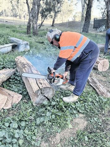 SKILLFUL SAWING: President of the Myrtleford Lions Club, Tom White, wielded the chainsaw with precision to collect new material for