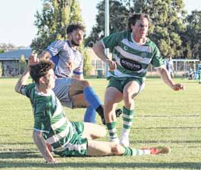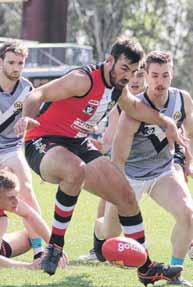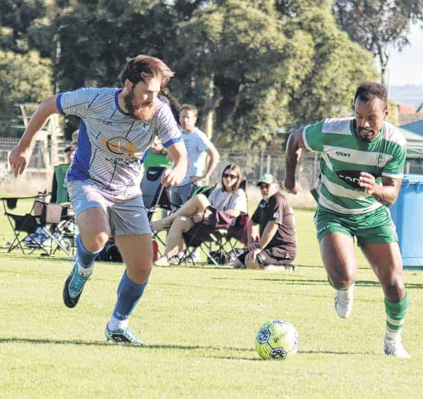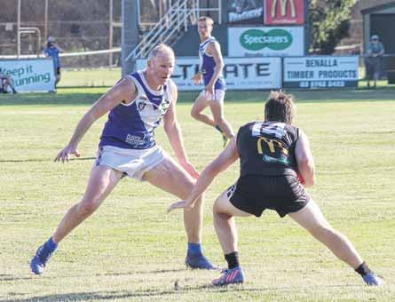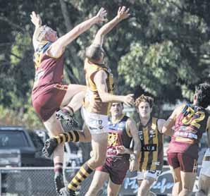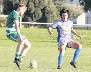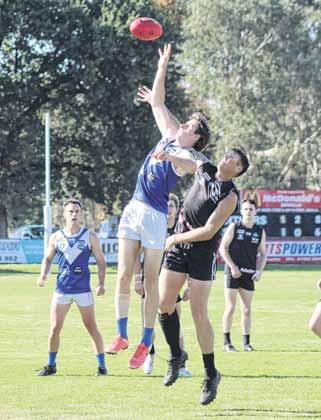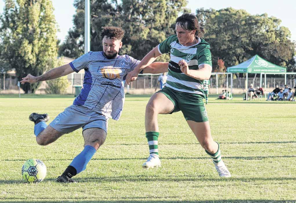 MATT Richardson of the Myrtleford Savoys is a tussle with Albury United defender Sebastian Dalitz as Richardson almost won his side the three points over the reigning champions United scoring a hat trick, but a late equaliser saw the game end at 3-3 in a wild finish. Full Savoys coverage on page 29.