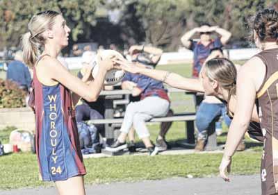 goal shooter and Tayla Allen moving from the midcourt to goal attack, Whorouly maintained their offensive pressure and defensive class, pushing the margin out to 13 goals by half-time.