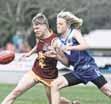 BRIGHT’S Dylan Bursill bears down on Moyhu’s Josh Coonan in the Mountain Men’s elimination final win. Bright were dominant early despite a third quarter fade to run out winners