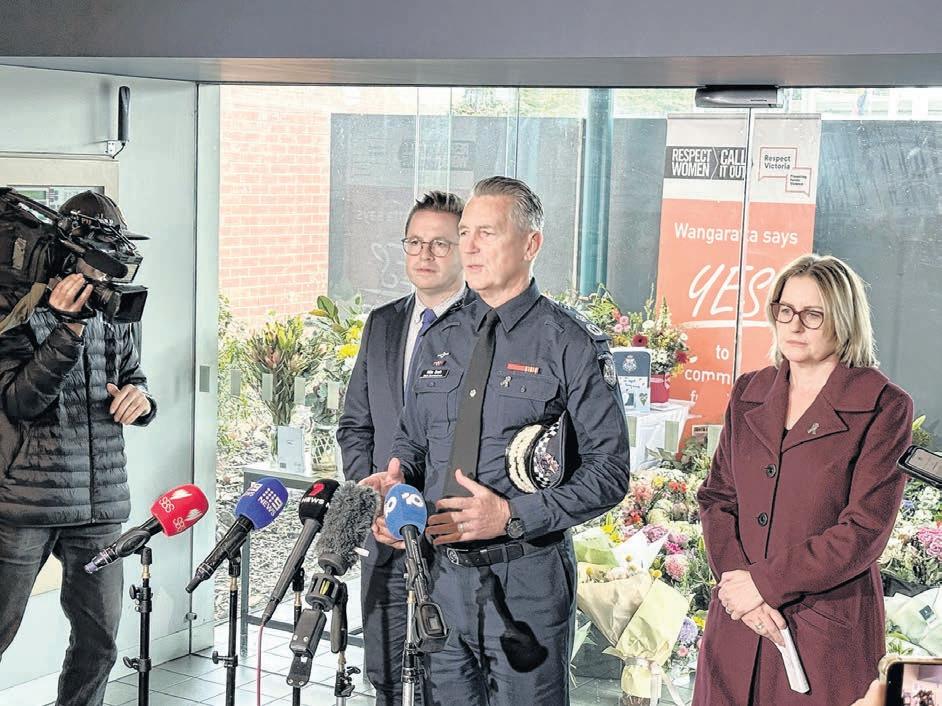 Victoria Police Chief Commissioner Mike Bush was joined by Premier Jacinta Allan and Minister for Police Anthony Carbines at Wangaratta Police Station on Friday, addressing media amid the floral tributes to Detective Leading Senior Constable Thompson and Senior Constable De Waart