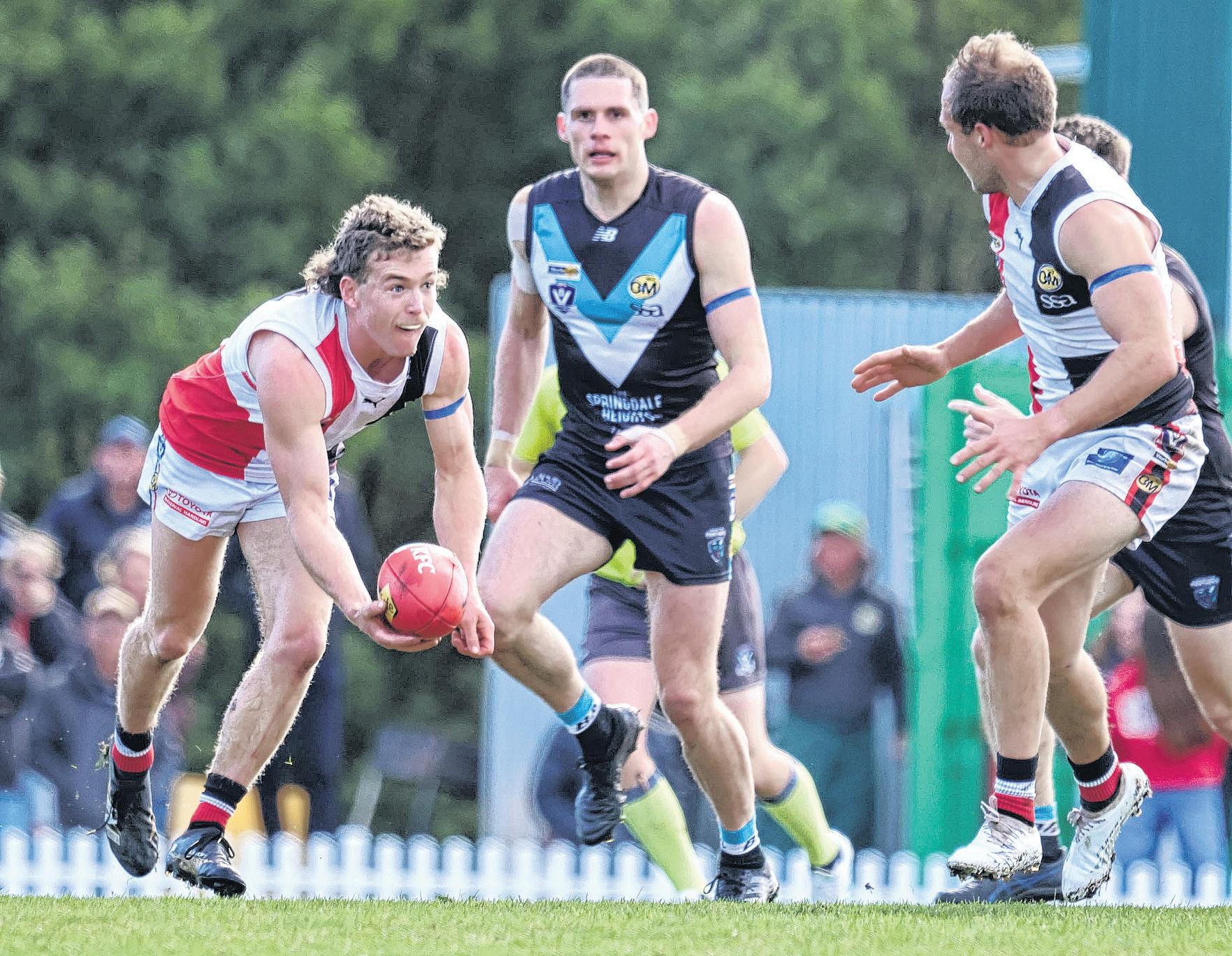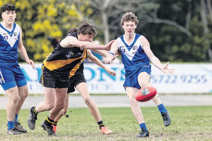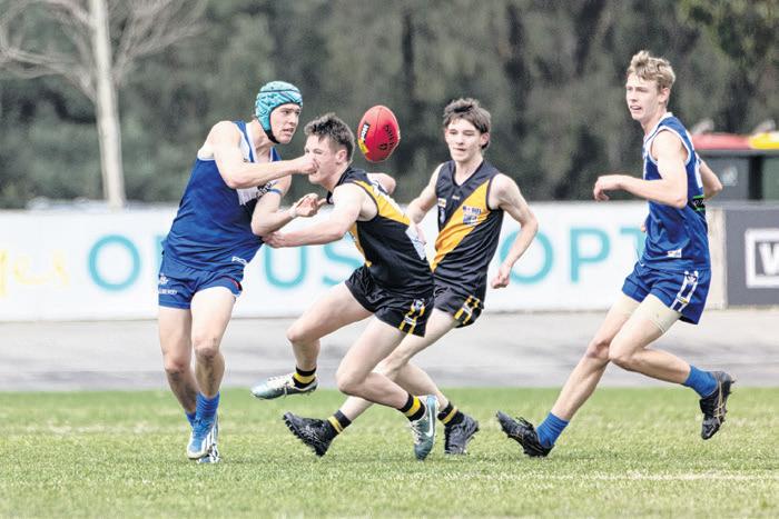 FAST HANDS: Jaxon East fires a quick handball to Mitch Dalbosco.