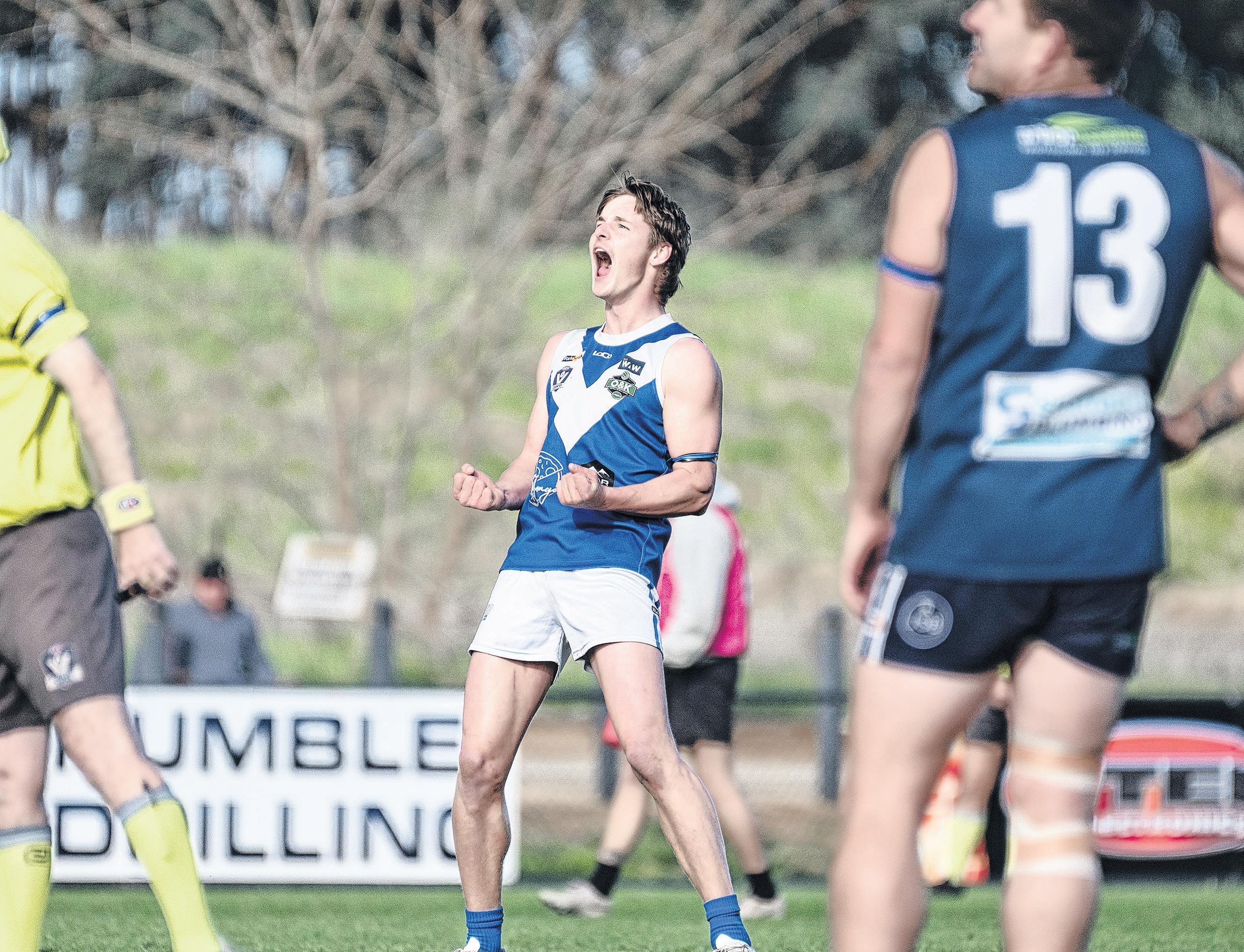 Cooper Thomason celebrates one of his three goals in Bright’s qualifying final win over Greta on Saturday, booking their place in the O&K grand final.