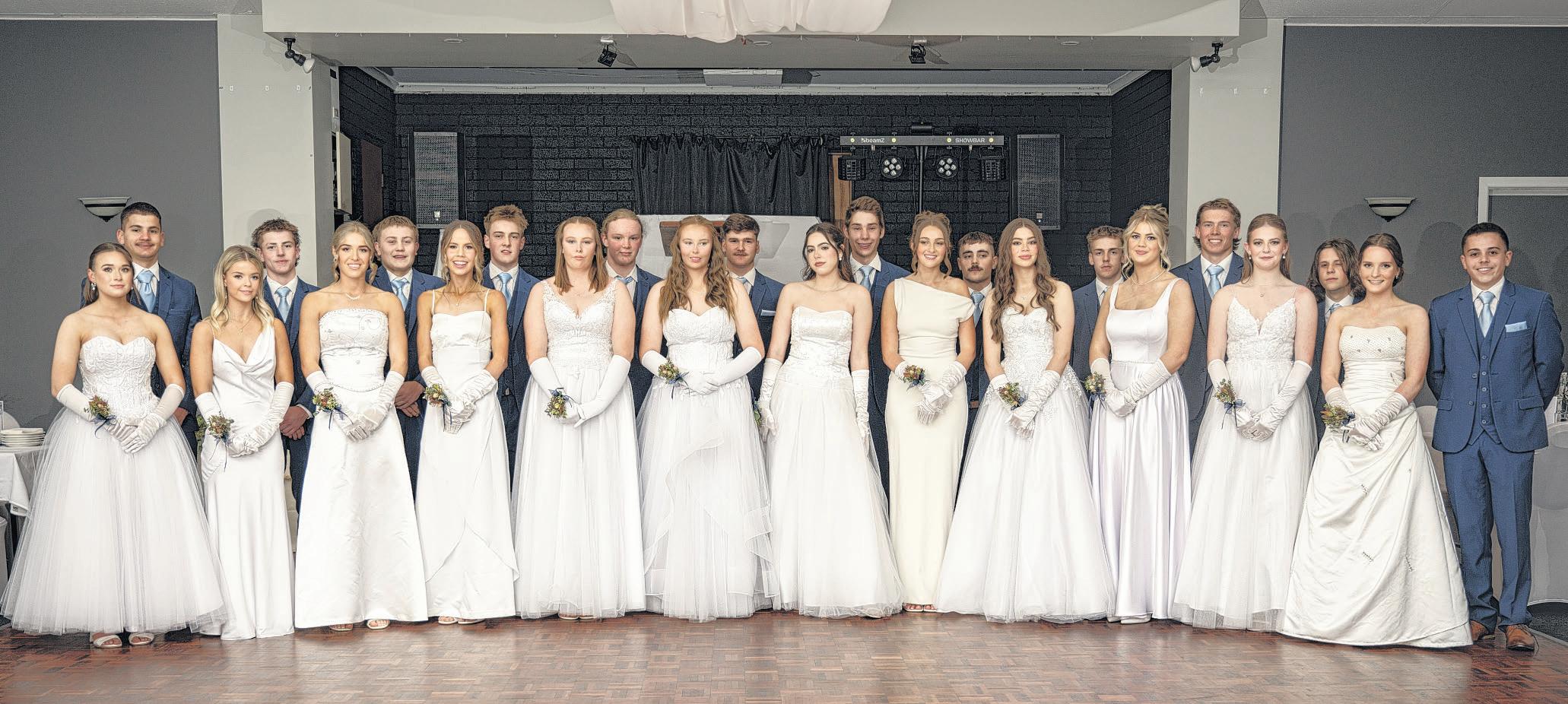 DANCING AT THIS YEAR’S DEB: Marian College debutantes and partners (from left) Helina Murphy, Lucas Masin, Krystal Hill, Charlie Piazza, Skylah McPherson, Izak Borsi, Jade Hazeldine, Nicholas Schmidt, Rhiannon Shallue, Benjamin Russell, Katelyn Shallue, Jed Toohey, Ana Reis Fornaciari Ramos, Dann Bynon, Gemma Bodsworth, Thomas Morgan, Adena Grieg, Paddy Smith-Allen, Lily Burton, Taj Cooper, Kahlee O’Sullivan, Will Rooney, Eliza Burke and Logan Bonacci kicked up their heels at St Mary’s Parish Debutante Ball 2025. PHOTO: Travis Cartwright