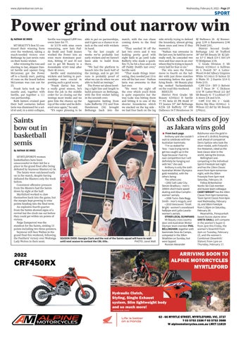 side strictly trying to defend the boundary, almost giving them ones and twos if they wanted it. “Nathan was awesome in the last over, he held his nerve really well, he conceded two twos and four ones in an over where they’re trying to launch every ball for four or six.” The win sees the Power move to fourth on the ladder with just three matches remaining before the qualifying finals - Mt Beauty play top ranked Yackandandah on the road this weekend. RESULTS District First Grade: Mt Beauty 4/243(cc) D Saville 77 FA Iaria 65 PR Dodd 37 TT Jeanes 33* def Bethanga 8/236 LB Rafferty 73* MB Dalbosco 34 T Henderson 34