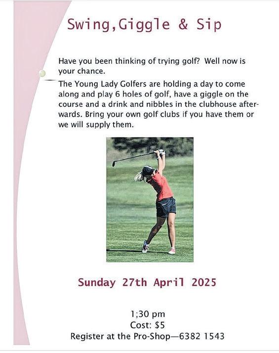 On Sunday we have Swing, Giggle and Sip for all ladies to come and and have a try on the golf course. Come to the club for a 1.30 start, cost is $5. Register at the Pro Shop 6382 1543.