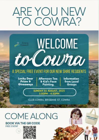Please join us for an informal catch-up over afternoon tea at our Welcome to Cowra event. We’ll have lots of information available about our town and villages; locals on hand to answer your questions; and community and sporting group representatives sharing their details.