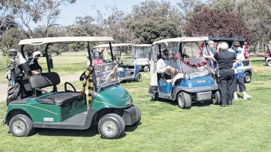 EUROA Golf Club hosted a fun games and activities day on the AFL Grand Final public holiday (Friday). Golf carts and participants were dressed in their favourite footy colours. Pictured in Demons and Kangaroos colours are Annette Smith, Robyn Anthony and Phil Squires. More photos on page 5.