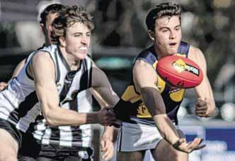 UNDER PRESSURE: Mitchell Walters shows good pressure as the Eagles player just gets the handball out.