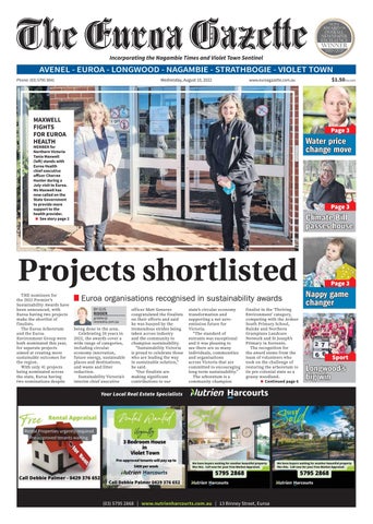 Euroa organisations g recognised g in sustainabilityy awards BY its GUS small RIDDER population is gridder@ representative nemedia.com.au of the work being done in the area. Celebrating 20 years in 2022, the awards cover a wide range of categories, including circular economy innovation, future energy, sustainable places and destinations, and waste and litter reduction. Sustainability Victoria’s interim chief executive
