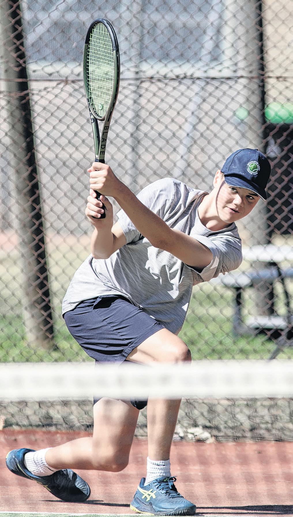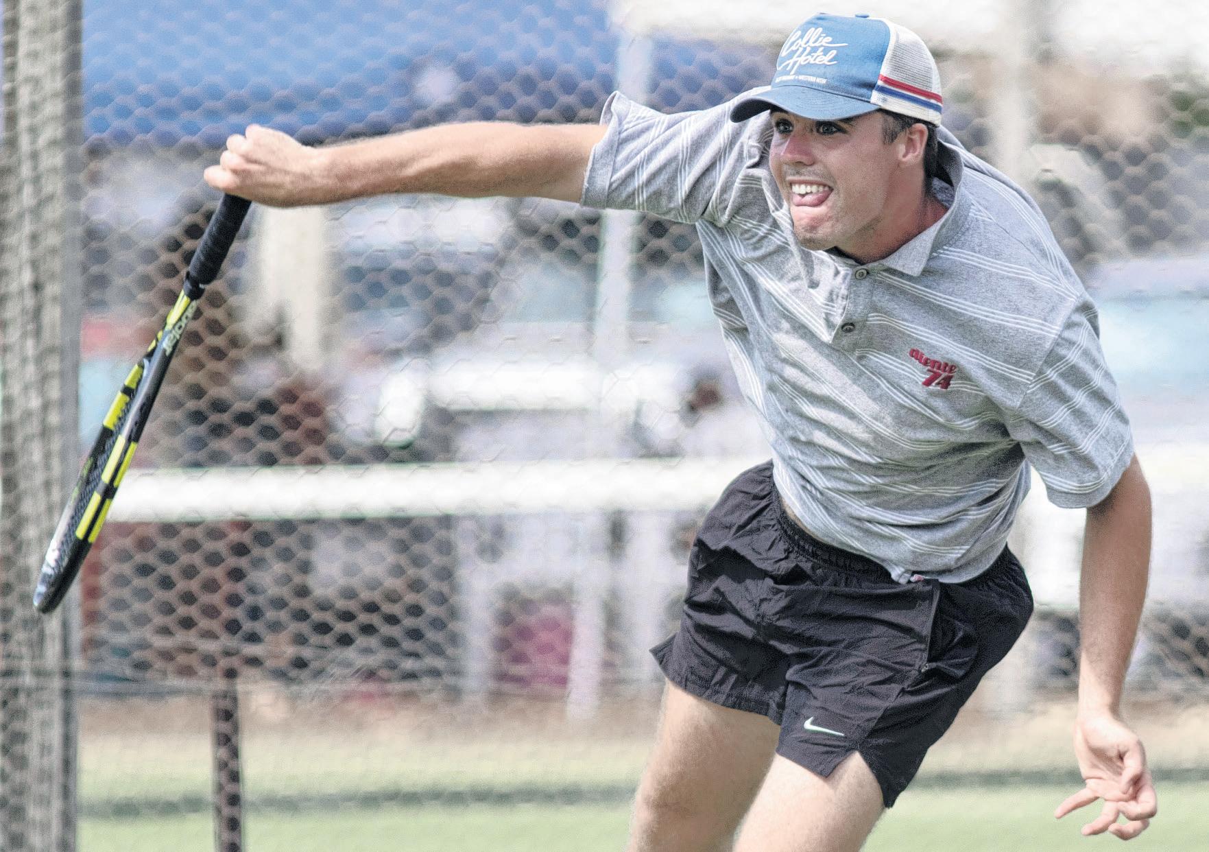 CHARGING IN WILL Beaton fires a serve o during his mmatch at the Euroa Lawn Tennis Club’s 95th Labour Day Tournment at the weekend.