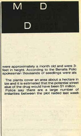 DRUGS FOUND IN FOREST: A marijuana plantation was raided in the Strathbogie State Forest in 1985, with between 8,000 – 12,000 plants with a street value of $1 million seized and destroyed (article featured in the December 3, 1985 edition).