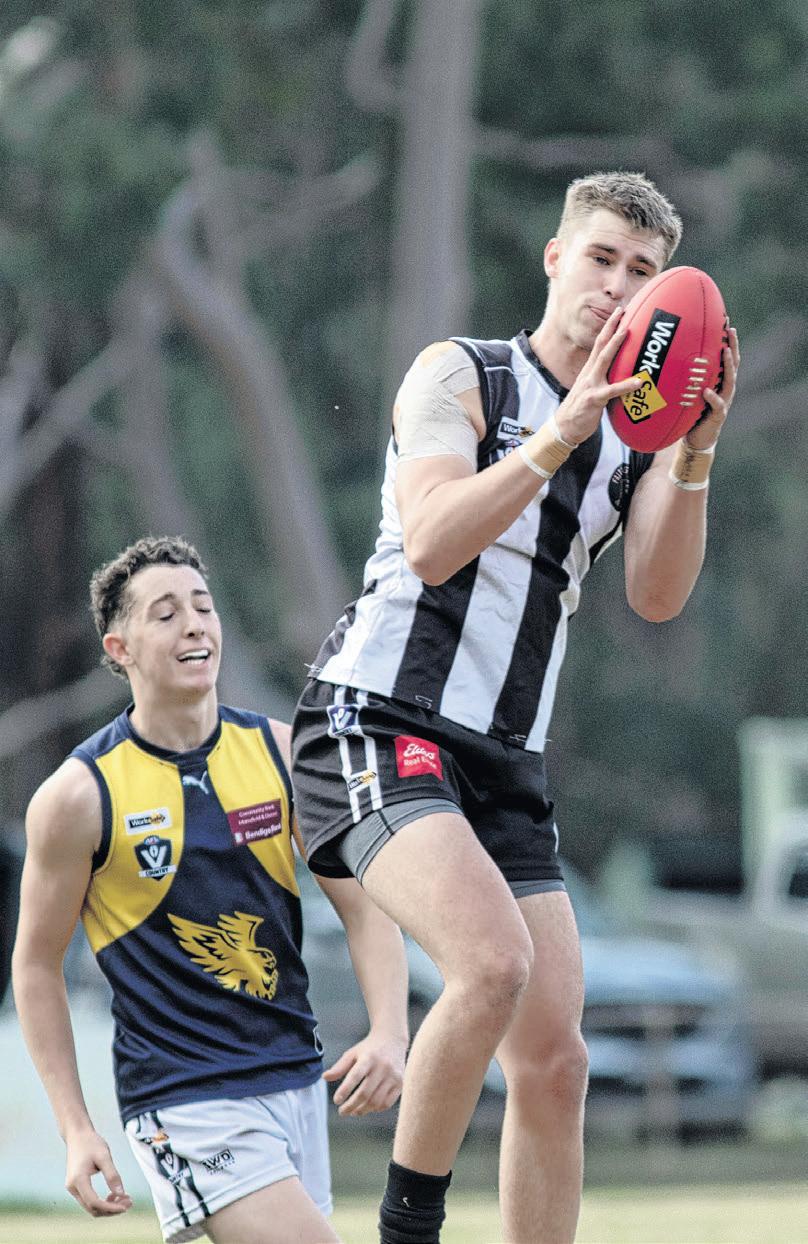 CONTESTED MARK: Cohen Paul leaps in front of his Mansfield opponent to take a strong mark.