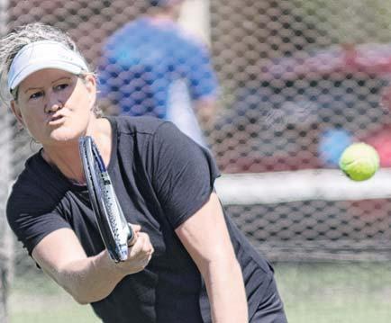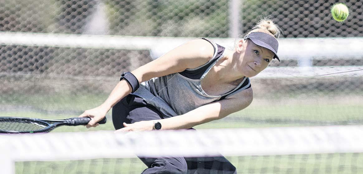 TOTAL FOCUS: Jane Fuge stays locked in, perfectly covering her forehand.