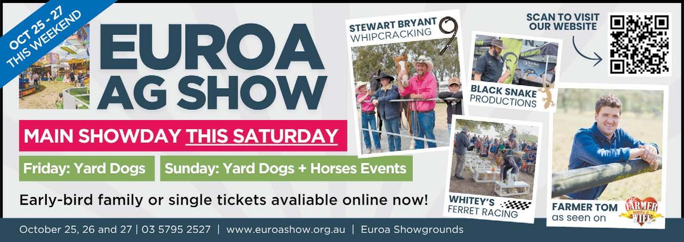 The Euroa Agricultural Society Inc will hold the 132nd Euroa Agricultural Show at the Euroa Showgrounds.
