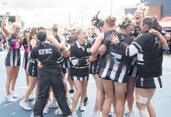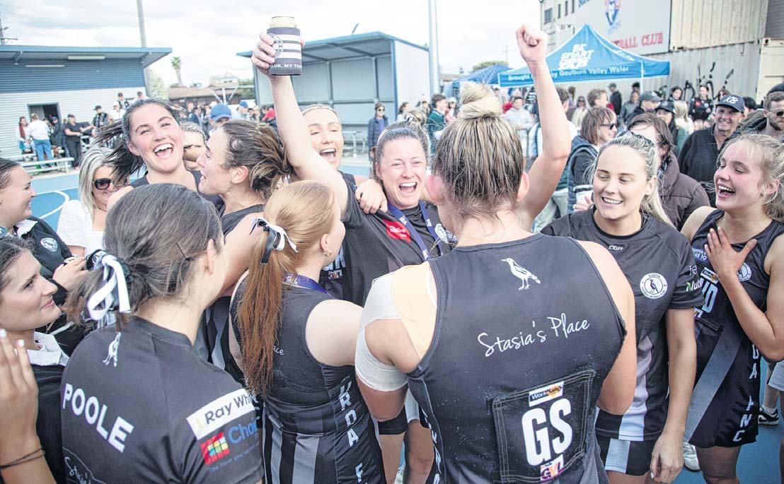 EUROA’S A Grade and B Grade netball teams both won their grand final matches on Sunday. In this picture, A Grade teammates celebrate, with veteran netballer Megan O’Bree raising both hands in victory, one of which also holds a stubby.