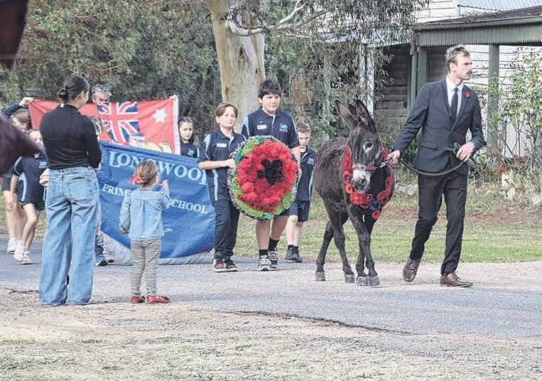 Over 100 people attended the Longwood ceremony a er a ystrong contingent of veterans, community groups, and relatives marched down from the local primary school led by a donkey called ‘Donkey’, in honour of Gallipoli legend John Simpson Kirkpatrick.