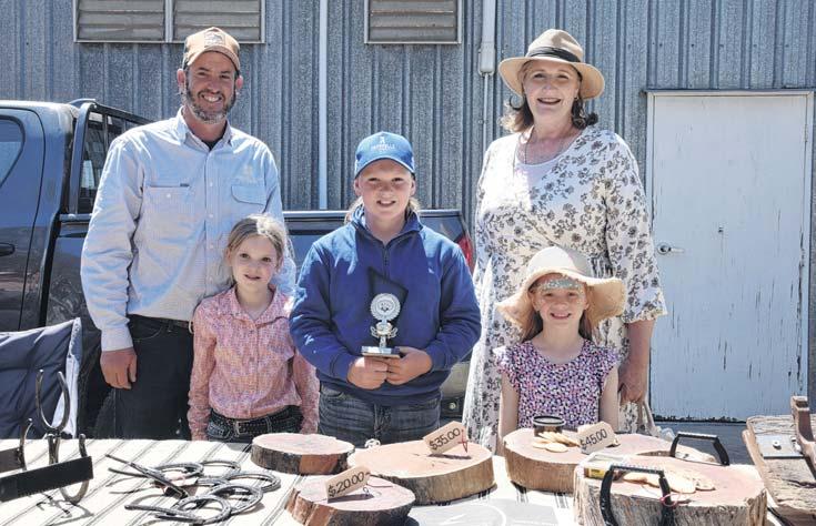 YOUNG TALENT: Carter Simmons (centre) with the the Len Stevens Memorial trophy for a trade space exhibit. He is pictured with his dad Jace Simmons (left), sister Paisley (8), Carol Stevens, and Ms Stevens’ granddaughter Charlotte Sanford.