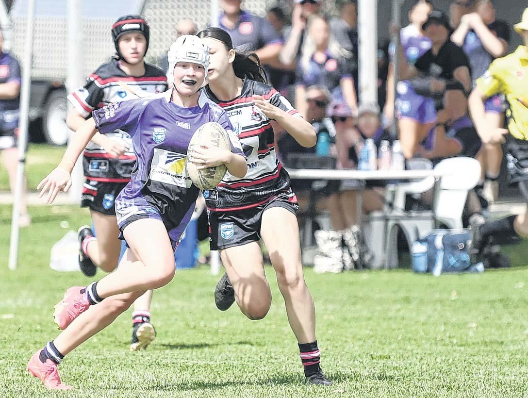 Rachel Grimmond powers forward for Lachlan Under 14s in their home game against Goannas while (inset) Kitarna Atkinson is on the fly for the undefeated