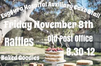 Eugowra Hospital Auxiliary is holding their annual cake stall to raise funds for the MPS from 8:30am to 12pm. All your favourite baked goods, giant Christmas raffle, plants, and 100s club. Tickets are available over the next three weeks at Danny’s, The Fat Parcel and the Craft Shop.