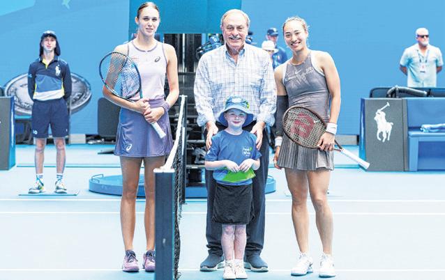 ▶ Ivey Rousell on court with Anca Todoni, John Newcombe, and Qinwen Zhang for the coin toss. PHOTO: Supplied