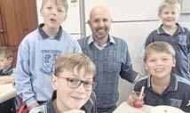PICTURED: George Armstong, Clarence McMahon, Mr Cartwright, Walter McMahon and Aiden Dennis enjoy the Principal’s Morning Tea. PHOTO: Supplied