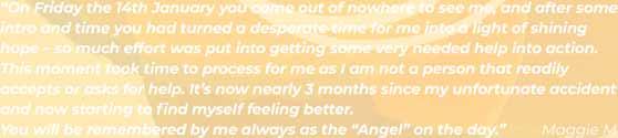 “On Friday the 14th January you came out of nowhere to see me, and after some intro and time you had turned a desperate time for me into a light of shining hope – so much effort was put into getting some very needed help into action. This moment took time to process for me as I am not a person that readily accepts or asks for help. It’s now nearly 3 months since my unfortunate accident