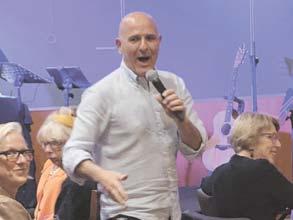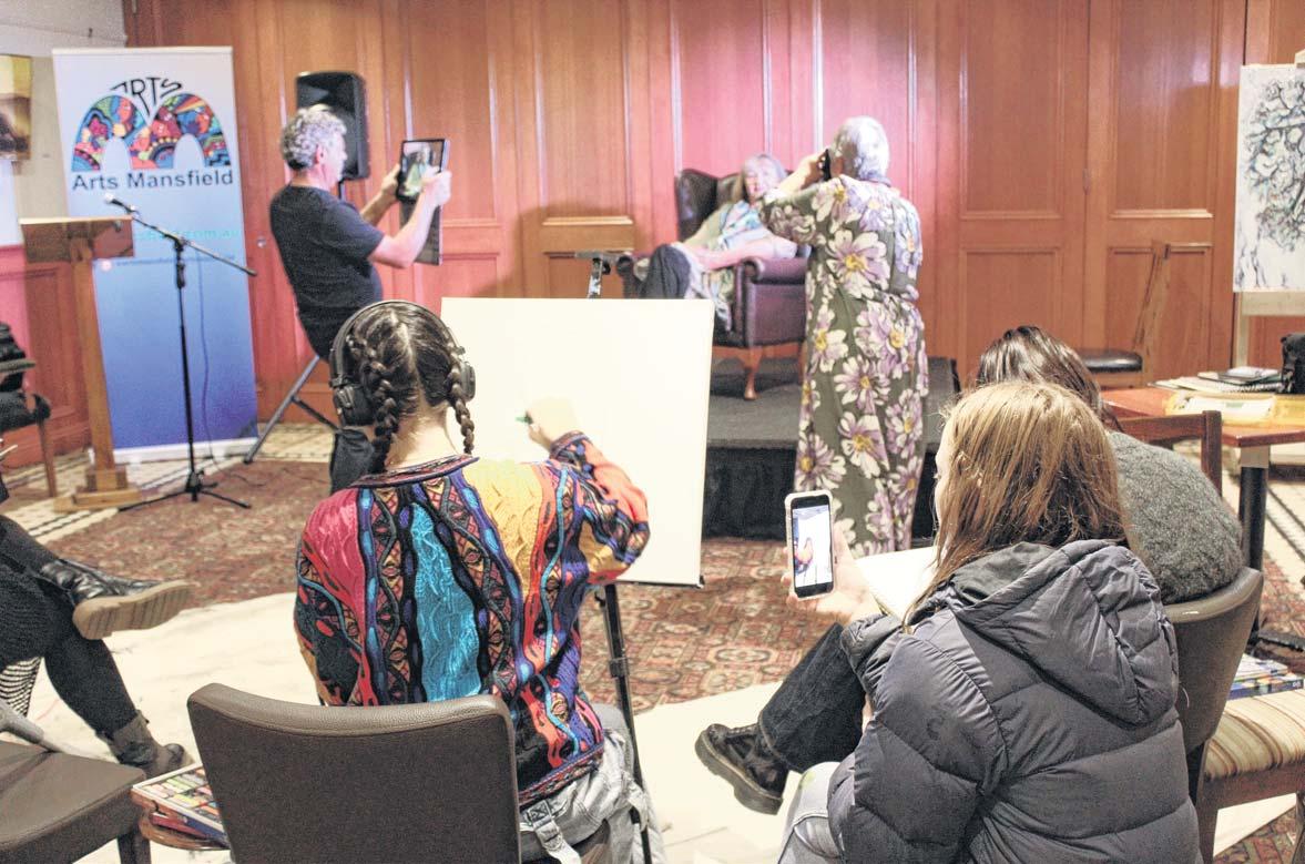 THE REVEAL: Artist Emily Doig, in her colourful jumper, takes a preliminary sketch of Cathie Smith, who was revealed last Friday night as the sitter for this year’s Three Faces Portrait Art Prize. FULL STORY to follow next week.
