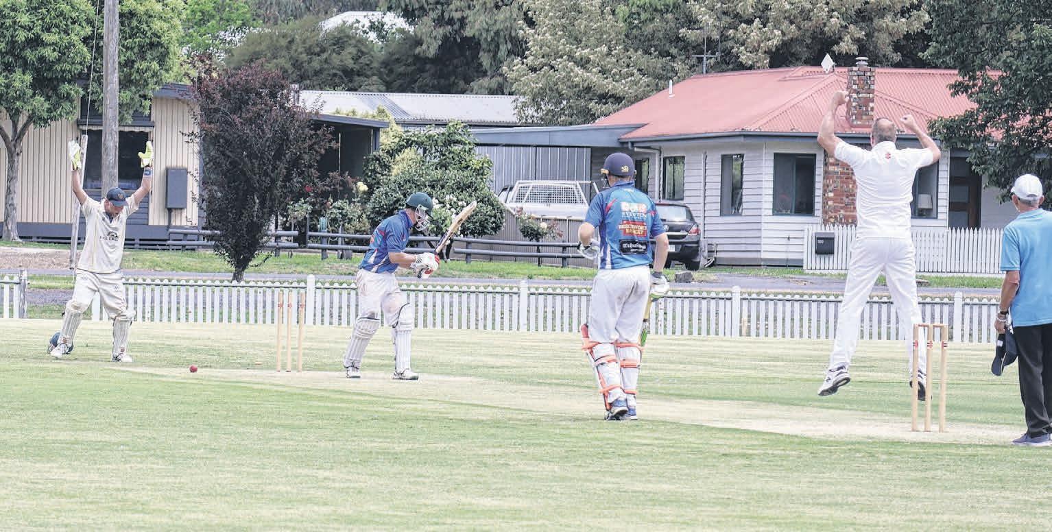 BREAKING THROUGH: Delatite B grade celebrates a crucial breakthrough against Beechworth Wanderers. Despite this, dropped catches and the scorching conditions hampered Delatite’s e orts, allowing Beechworth to post 7/154. In reply, Delatite’s chase faltered under consistent bowling pressure, finishing at 7/98 in their final home game of the season.