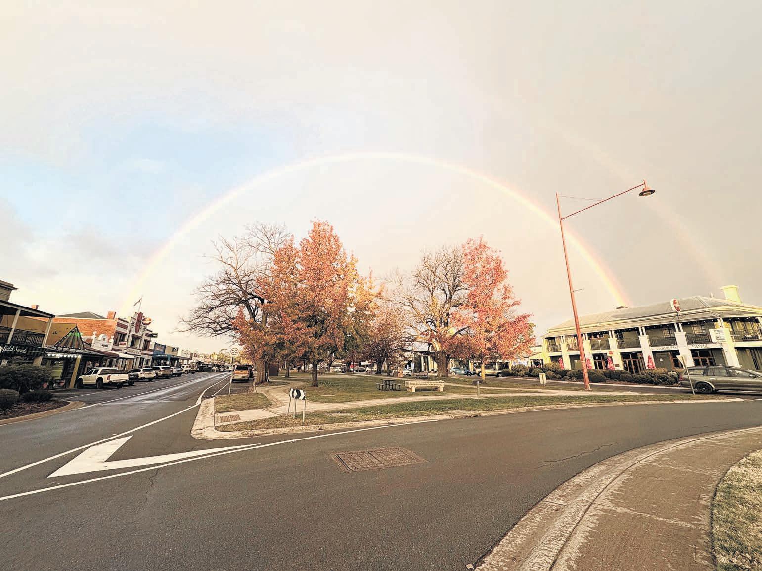 A spectacular double arc glows over Mansfield’s autumn trees and wet bitumen after a burst of rain last week.