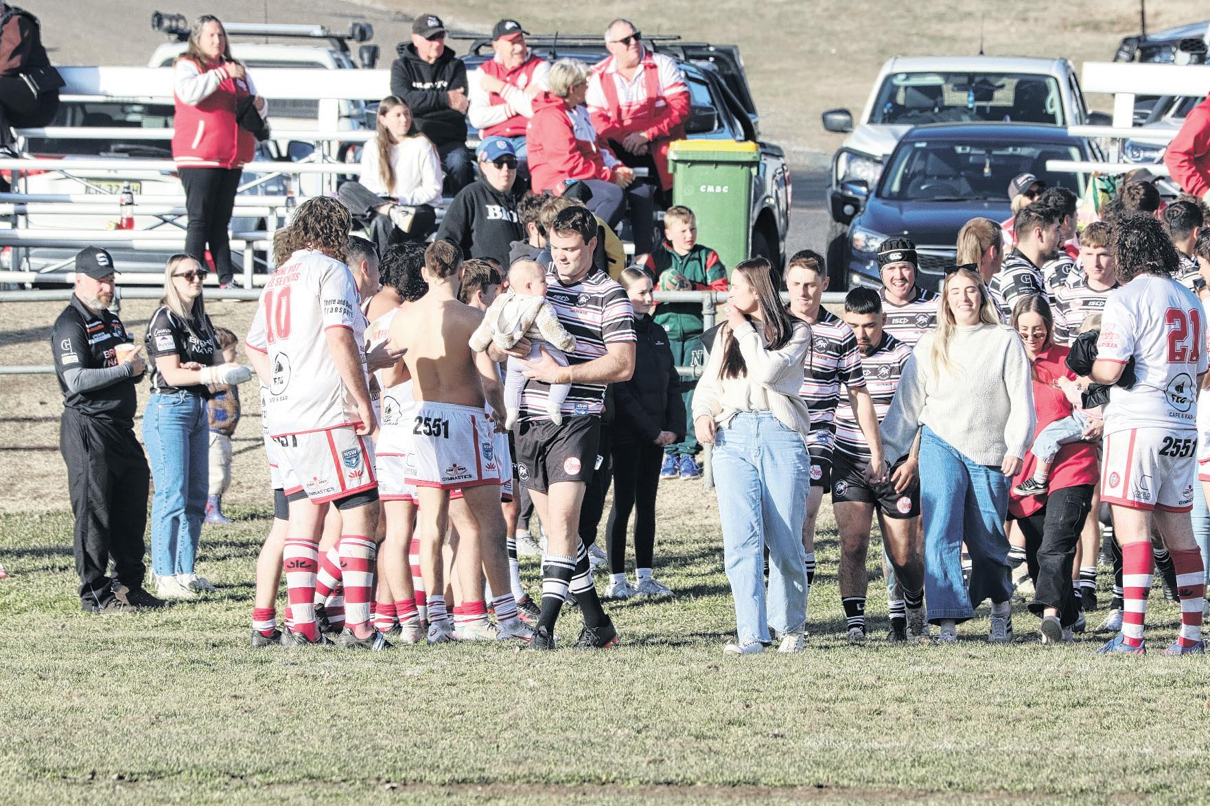 CELEBRATION: The Cooma Stallions held its annual ladies day on Saturday. Stallions first grade captain, James Cahill, walks onto the field with his daughter and partner.