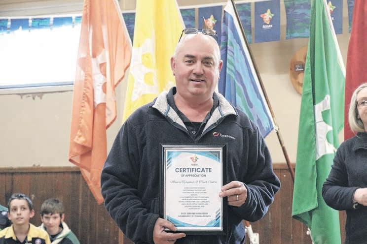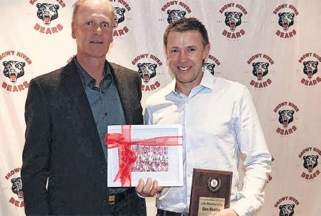 Mick Hamilton presents Ben Beattie with his life membership of the Snowy River Bears. Beattie was praised for his e orts over many years.