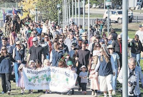 REFLECTING: Jindabyne CWA branch members, Sheila and June, proudly march during the Jindabyne ANZAC Day morning service.