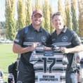 LOCAL TALENT: Cooma Stallions legend Sam Williams (right) presents Dempsey Woolf with his first grade Stallions jersey ahead of his club debut. Woolf is a talented young rugby league player and was thrilled to receive his jersey from Williams, who amassed more than 100 NRL games.