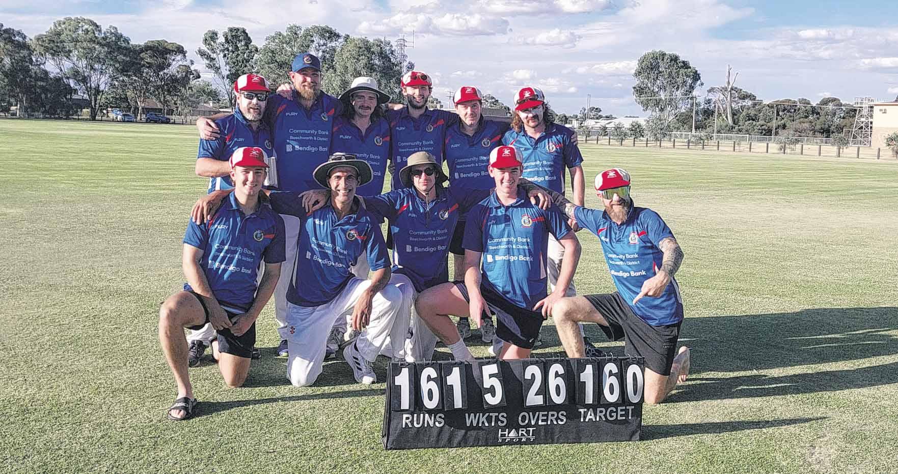 Beechworth’s C grade side celebrate after knocking off top of the table YarrawongaMulwala in the semi-final as they look to take on Greta in the grand final tomorrow at North Wangaratta Recreation Reserve.